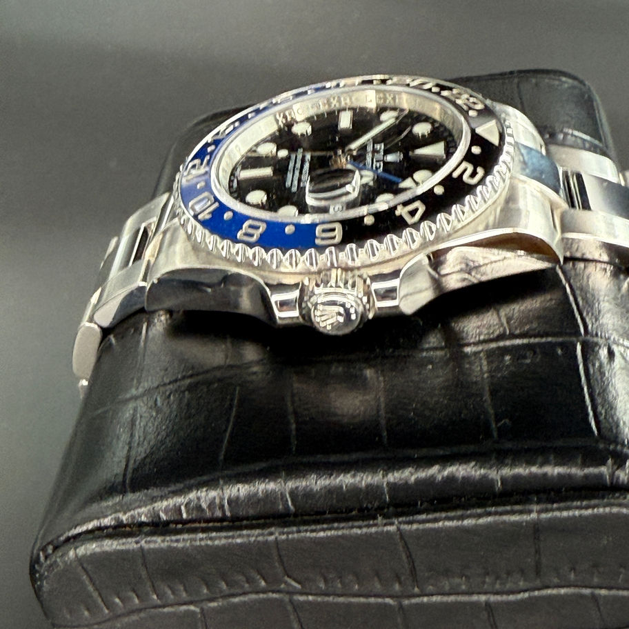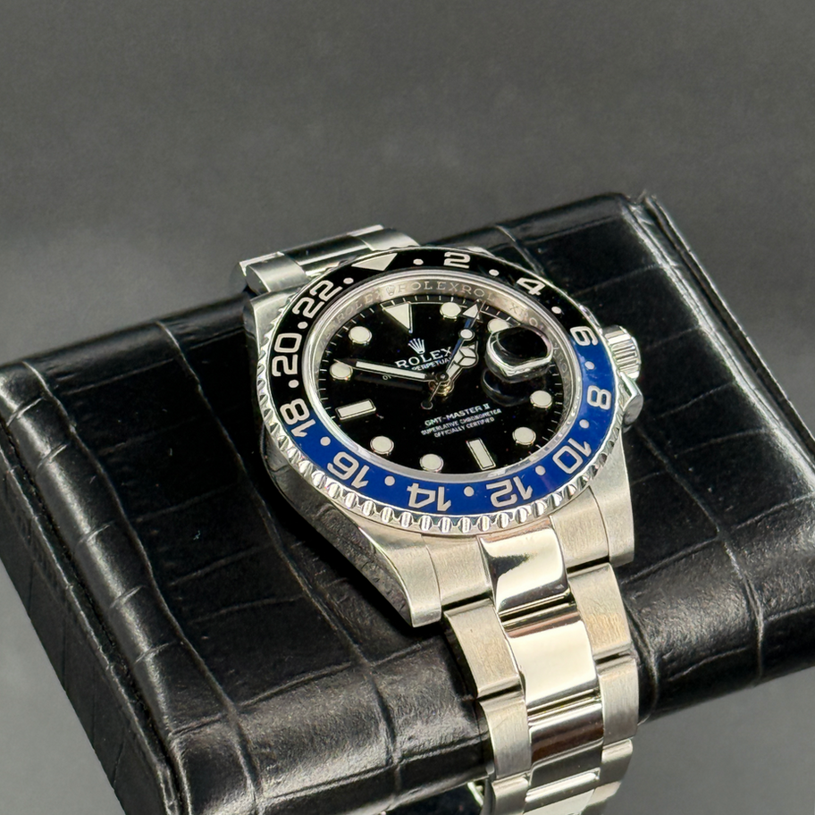 Experience the epitome of timeless sophistication with this 2013 Rolex GMT Master II "Batman" reference 116710B, a masterpiece cherished for its dual-time zone capability and striking blue and black bezel. This exceptional timepiece features a 40mm stainless steel case, a scratch-resistant sapphire crystal, and a Maxi dial with larger hour markers for enhanced legibility. Powered by the Rolex Caliber 3186 automatic movement, it offers robust performance and reliability. The Oyster bracelet comes with all links and with an Easylink 5mm comfort extension link ensures a secure and comfortable fit.
